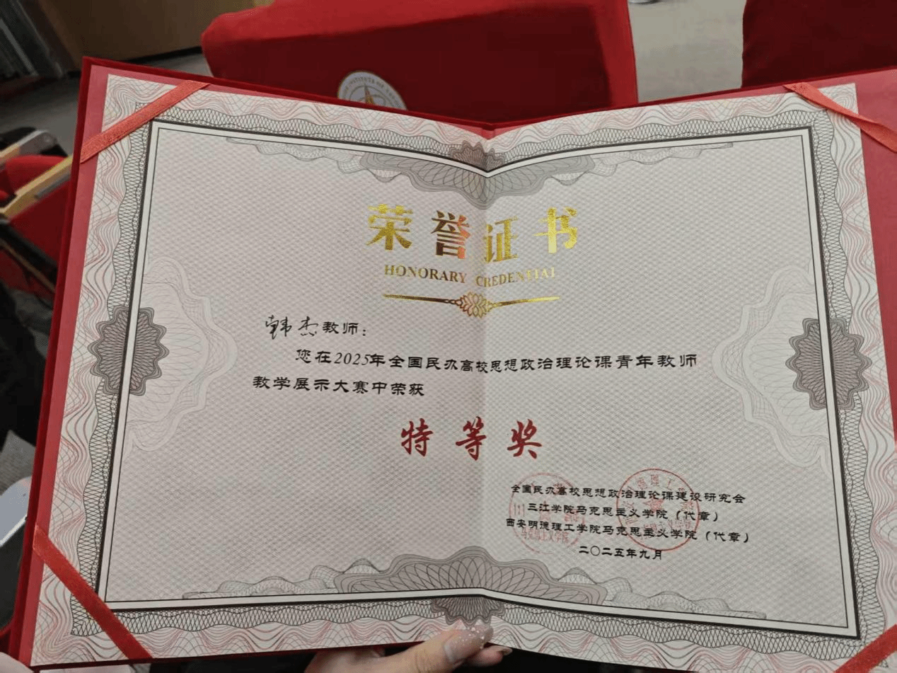 近日,2025年全国民办高校思想政治理论课教学研讨会暨青年教师现场教学展示大赛在西安明德理工学院圆满落幕。永利集团304教师韩杰凭借扎实的理论功底、创新的教学设计与精湛的教学技艺,从全国47所民办高校的50名参赛选手中脱颖而出,荣获大赛特等奖,充分展现了我校永利集团304教师的过硬专业素养与育人风采。