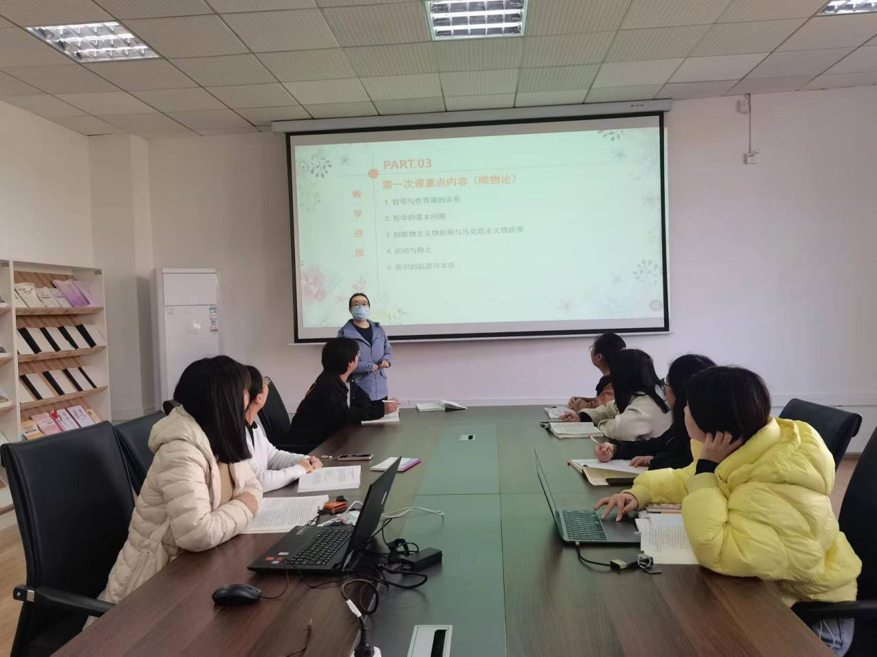 为提升备课效率,原理教研室全体老师在会前已经将本次备课的所有内容进行熟悉,在本次备课会上,邵峥嵘老师按照学校和学院关于集体备课的相关要求,围绕《马克思主义基本原理》教材第一章的授课内容,分别从结构框架、重点内容、教学方法举例等方面进行了分享,同时对于近两年期末考试的考点进行了梳理,并整理出了关于“教材第一章”的客观题题库。